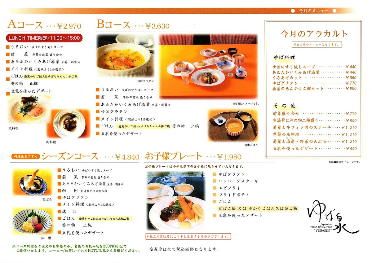 うるおい・前菜・あたたかいくみあげ湯葉・かわりゆば(湯葉グラタン)・メイン料理(魚・肉・天麩羅よりお選びください) ごはん(湯葉ごはん又はちりめん山椒ごはん)・香の物・止椀・ デザート