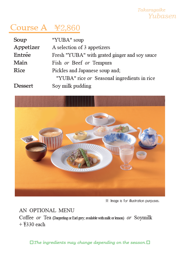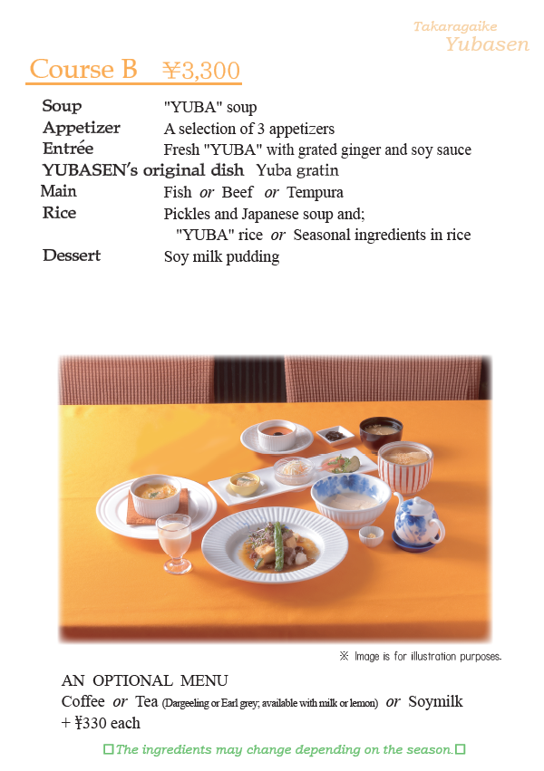 うるおい・前菜・あたたかいくみあげ湯葉・ メイン料理(魚・肉・天麩羅よりお選びください) ごはん(湯葉ごはん又はちりめん山椒ごはん)・香の物・止椀 ・デザート ※1/1~1/3はAコースのご提供を休止させていただきます。 ※ランチタイムのみのご提供です。